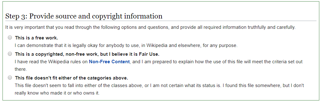 Next you have to provide source and copyright information. For your logo, you will select ‘This is a copyrighted, non-free work, but I believe it is Fair Use.’