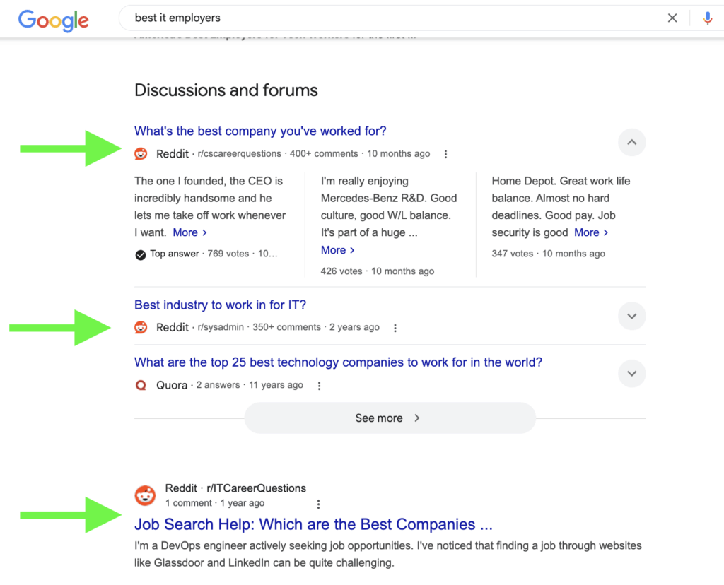 - User Engagement: Reddit threads are a hotbed for discussion. There are threads created over 10 years ago that still receive comments. Google infers that to mean users want to visit Reddit; therefore, it should be a top search result.