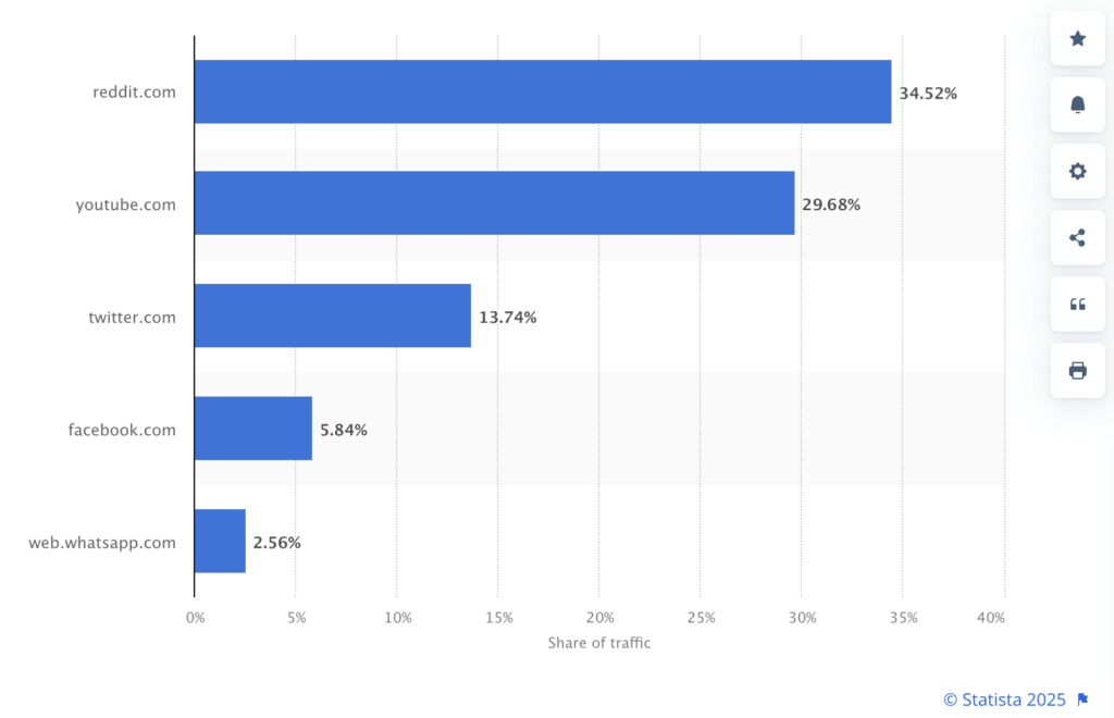 As of March 2024, Reddit contributed 34.52% of social media referral traffic to Wikipedia, making it the platform’s top traffic source.